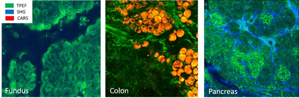 En utilisant des impulsions laser ultra-courtes focalisées dans les tissus, il est possible de générer des mécanismes de contrastes sans avoir besoin d’aucuns marqueurs fluorescents. C’est le cas de l’auto-fluorescence à deux photons (TPEF) qui révèle la présence de protéines, de la génération de la seconde harmonique (SHG) qui révèle la présence de collagène et des effets Raman cohérents (CARS/SRS) qui sont spécifiques d’un certain groupe de liaisons chimiques. Ces contrastes dits ‘sans marquage’ produisent des images des tissus dont la qualité approche celle de l’histologie. L’infrastructure nationale France Life Imaging mène un programme ambitieux de développement de ces technologies dans les modalités de microscopie et d’endoscopie et cherche à en évaluer leur performance en oncologie. Mise en œuvre dans des systèmes d’imagerie optique multimodaux, les microscopes et les endoscopes développés sont en cours d’évaluation pour l’imagerie des cancers gastriques (Figure) et celle des tumeurs cérébrales. L’ambition est de pouvoir réaliser une histologie virtuelle et en temps réel des tissus, c’est-à-dire s’affranchissant des étapes longues de prélèvement des tissus, de leur sectionnement et de leur coloration. Les microscopes et endoscopes ‘sans marquage’ développés pourront alors être utilisés directement dans la salle d’opération pour fournir des images tridimensionnelles des tissus, en temps réel, et faciliter ainsi les chirurgies et les traitements thérapeutiques associés.